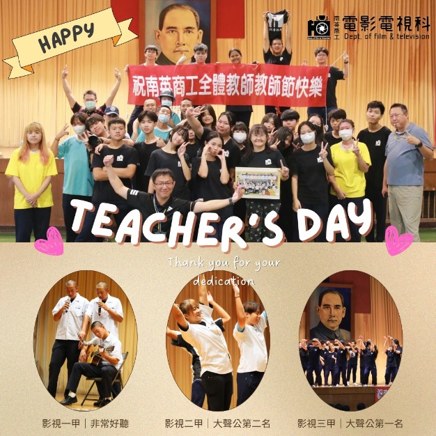 今年教師節大聲公比賽,本科榮獲佳績殊榮 · 影視三甲 | 第一名 · 影視二甲 | 第二名 而新秀影視一甲則是透過歌聲與吉他 讓台下師生享受了專業歌手級的天籟美聲 在這教師節期裡 期盼同學們快高長 也希望每天如同今天一樣 學會感恩、乖巧懂事、勇於嘗試、快樂學習